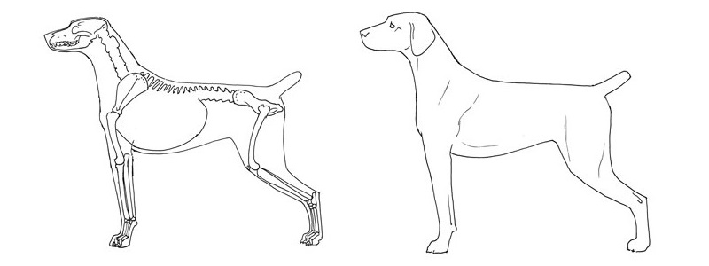 A correctly built and angulated, normal-legged dog such as this one has its legs correctly under its body for support, broad quarters with strong musculature, and a long, low side gait that is effortless and efficient. Illustrations by Marcia Schlehr.