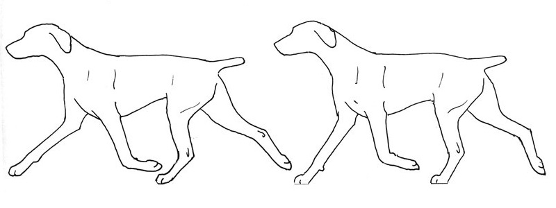 A dog with very open angles at both the shoulder and the hip stands with its legs far out on either end of its body, which does not lend correct support to the body. This dog will trot with a lot of lift and kick. While it may look like it is taking long strides, the feet are actually on the ground for only a short period during each step, which causes the dog to have to work much harder to move. Illustrations by Marcia Schlehr.