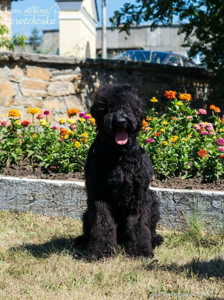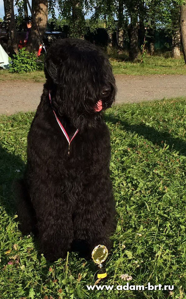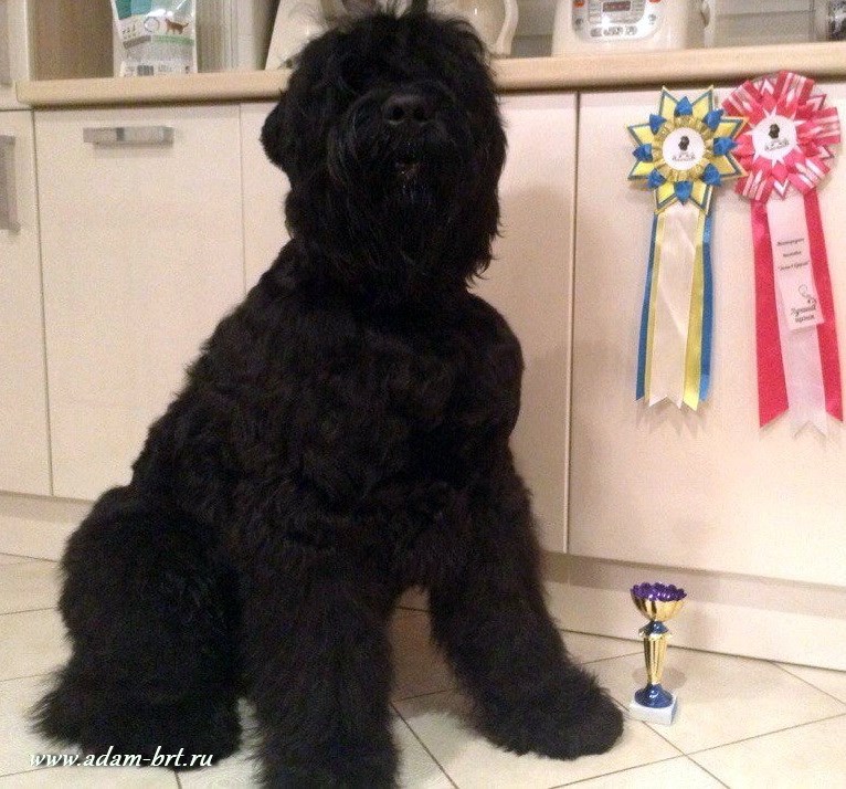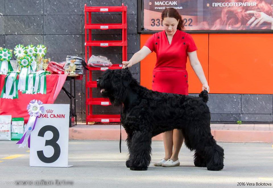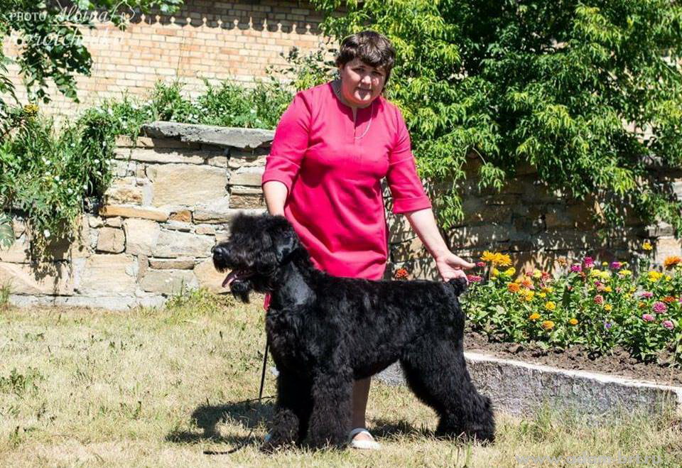 Has the titles: Champion of Russia, Junior Champion of Russia, Candidate to the Champions of National Club of Russian Black Terriers. Certifications: 2 x R.CACIB, 1 x CCHC, 1 x CC, 6 x CAC, 3 x CACjun, 1 x BOB, 3 x BJ, 4 x BP. Health tests: HD-A/A, ED-0/0. Pedigree.