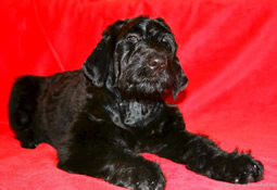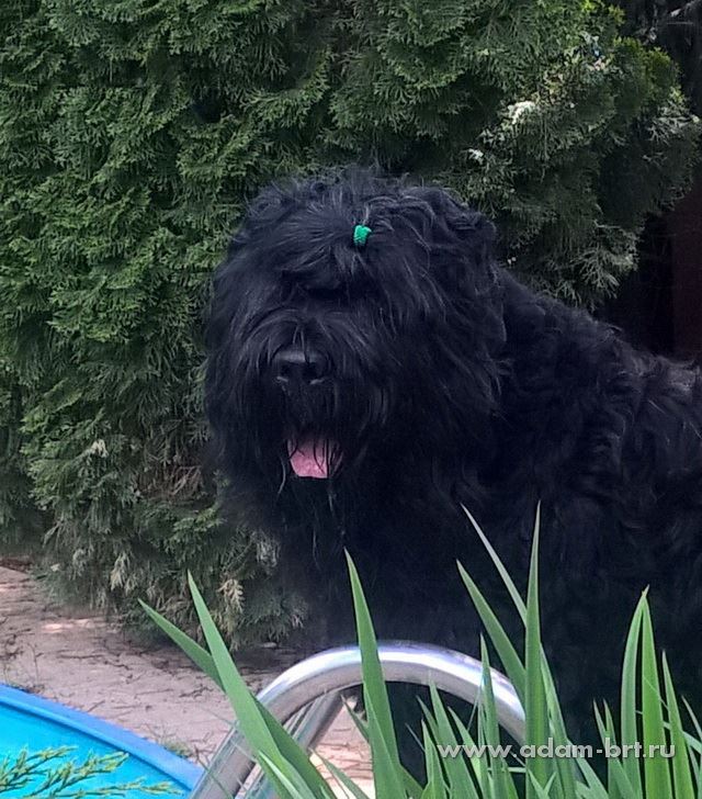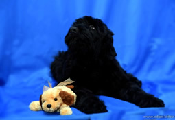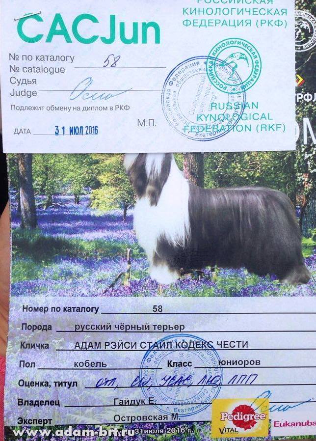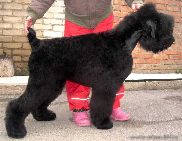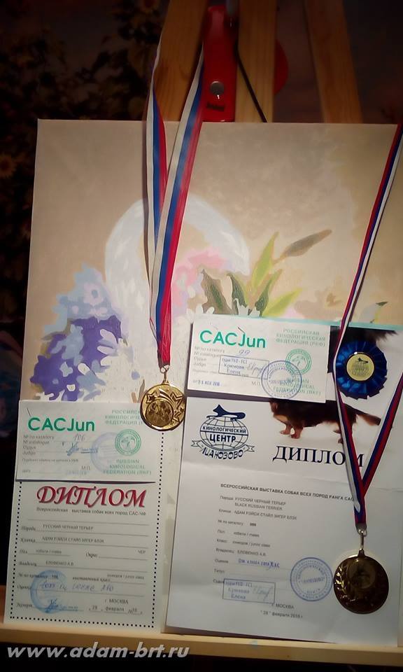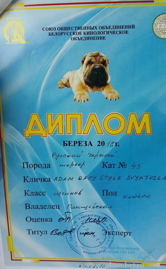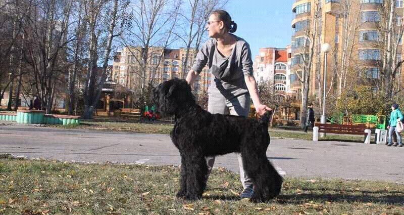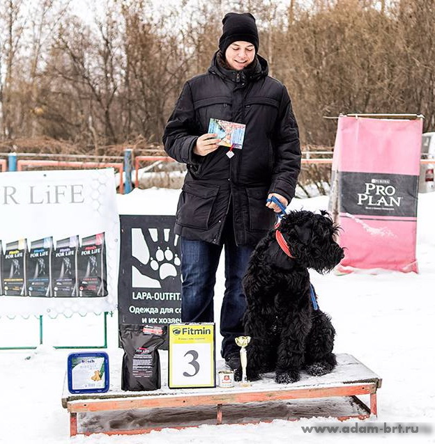 Has the titles: Champion of Russia, Junior Champion of Russia, Candidate to the Champions of National Club of Russian Black Terriers. Certifications: 2 x R.CACIB, 1 x CCHC, 1 x CC, 6 x CAC, 3 x CACjun, 1 x BOB, 3 x BJ, 4 x BP. Health tests: HD-A/A, ED-0/0. Pedigree.