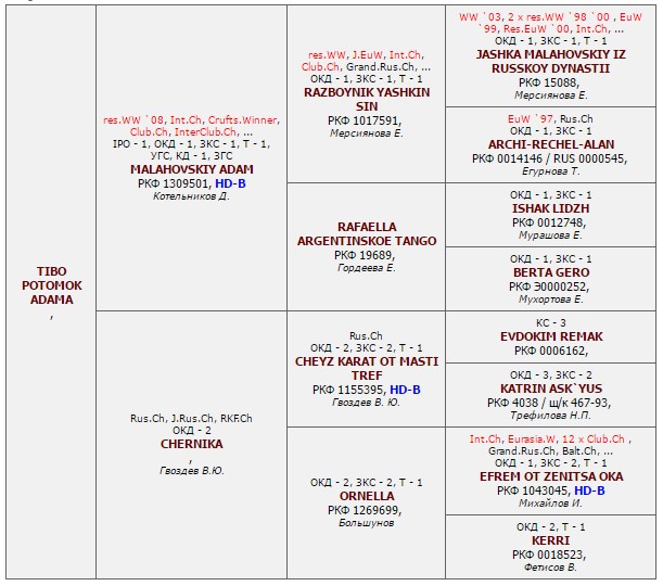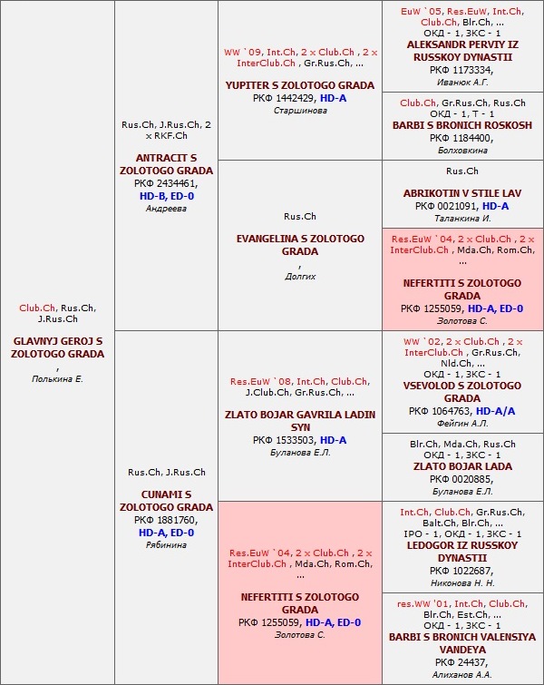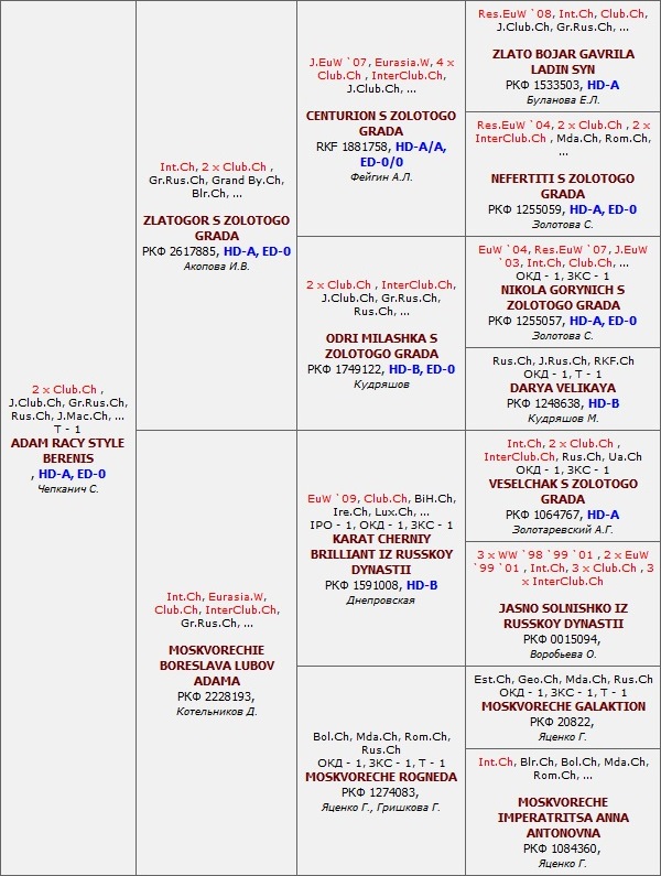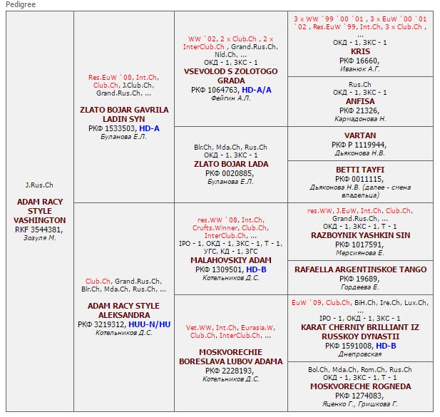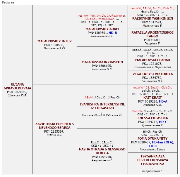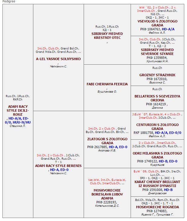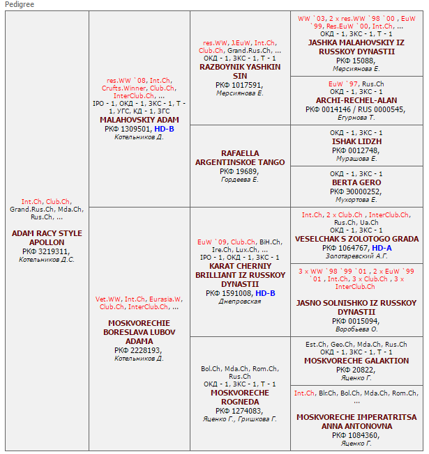 Has the titles: Interchampion (FCI), Champion NKF, Champion of RUSSIA, Junior champion of RUSSIA, Grand Champion of RUSSIA, the Prize-winner of Main Mono Breed Dog Show RED STAR, Champion of MOLDOVA, Champion RKF õ 4, Champion OANKOO, Champion RFOS, Champion RFLS. Certificates: 4 x CACIB, 1 x R.CACIB, 5 x CAC. Pedigree: