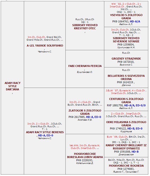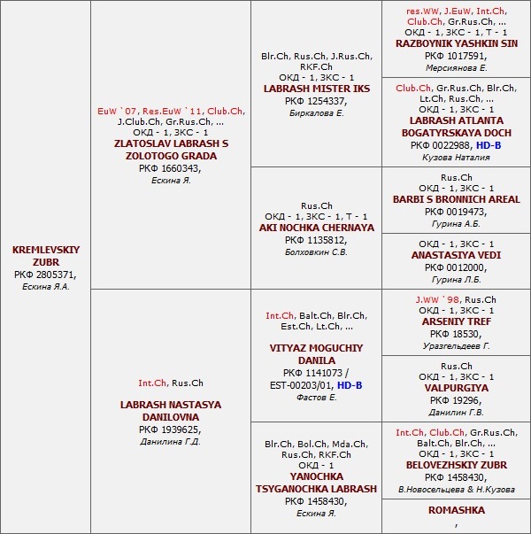 Has the titles: Champion of National BRT Club, Grand Champion of Russia, Champion of Russia, Junior Champion of Russia, Champion RKF, RFLS Champion , RFOS Champion, RFSS Champion,