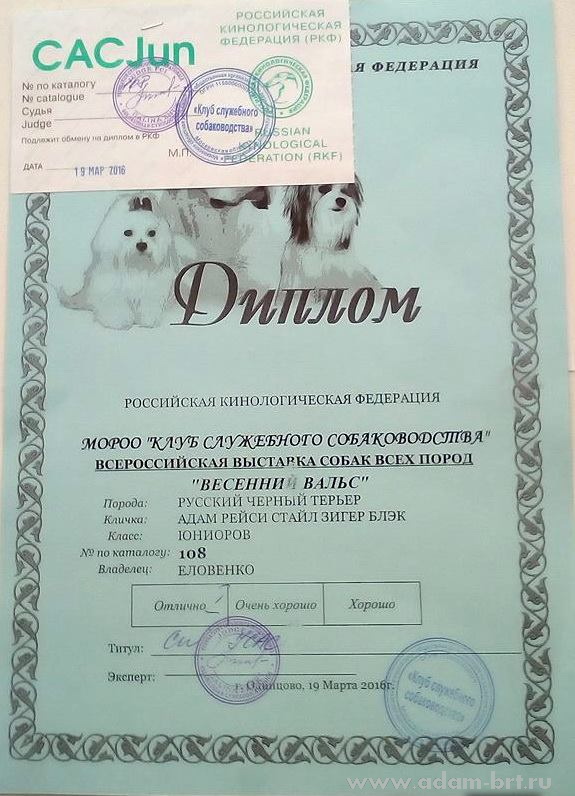 April 23, 2016 Regional Multi Breed Dog Show rank CAC CCHF RFOS "ZHEMCHUZHINA URALA", which held in Zlatoust city, Chelyabinsk region, Russia, where under judge of expert Grin O.A., Russia