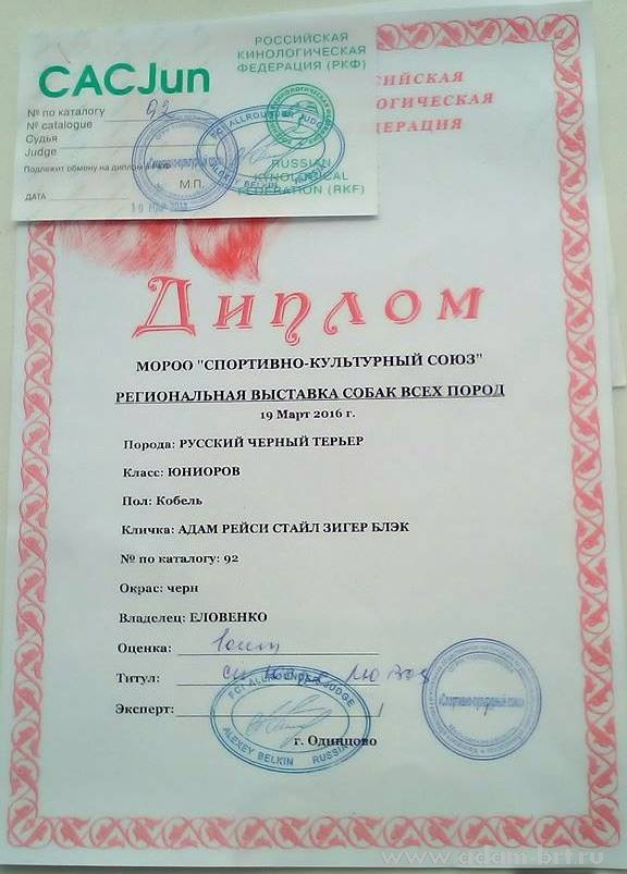 April 24, 2016 held the Regional Multi Breed Dog Show rank CAC CCHF RFLS "RYAZANSKAYA VESNA 2016", which held in Ryazan city, Russia, where under judge of expert Manzenko V.V., Ukraine