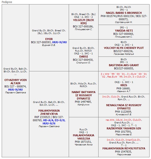Has the titles: Grand Chamion of Belarus, Champion of Belarus, Champion of Baltic, Champion of Belarus, Champion of Latvia, champion of Lithuania, Champion of Russia, Champion of Estonia, Champion of breed (Belarus). Certificates: 16 x CAC, 9 x BOB, 12 x BOS. Tests: HD-A/A, ED-0/0, HUU N/N, test +/+. Pedigree: