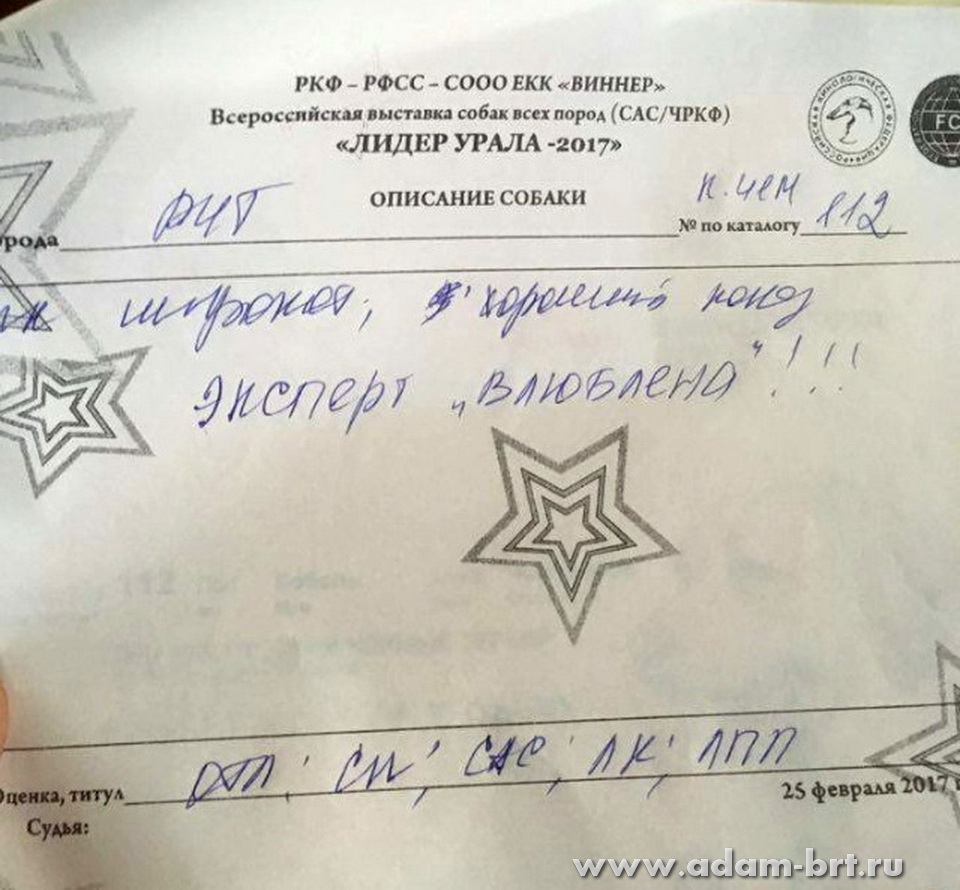 Among his titles - Junior WINNER of National BRT club, a five-time BEST BABY of BREED, Twice BEST PUPPY, Twice BEST of OPPOSITE SEX, and many others.