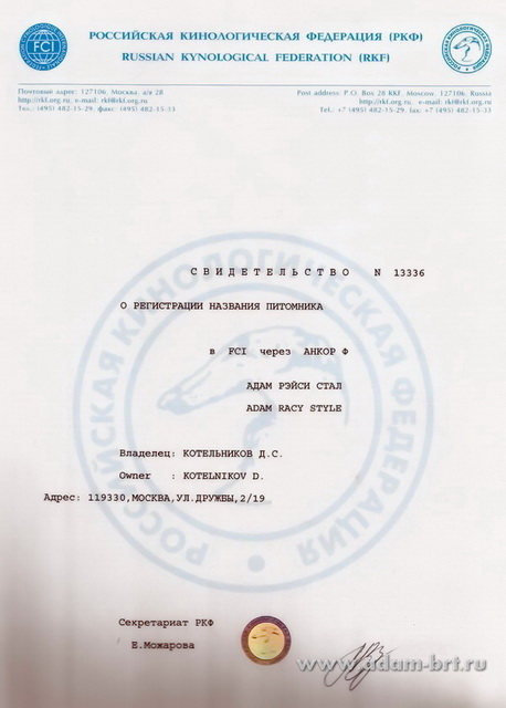 Kennel "ADAM RACY STYLE" was registered and authorized in the FCI and Russian Kynological Federation under Сertificate number 13336.
