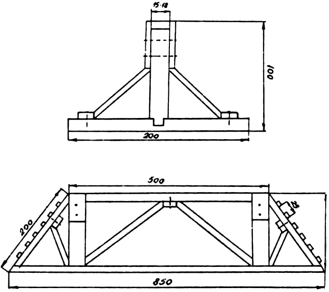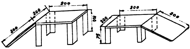 Окоп. Препятствие состоит из помоста разбега и помоста приземления. Каждый помост состоит из горизонтального и наклонного щитов длиной 2 м. Ширина щитов 1 м. Горизонтальные щиты помостов устанавливаются на поперечных опорах /две опоры на каждый щит/ длиной 2 м. Высота горизонтального щита помоста разбега 1 м, помоста приземления 0,75 см. Разрыв между помостами 1,5 м. Вся площадь проема выстилается гимнастическими матами. Материал для изготовления окопа - доски толщиной 40 мм, длина проекции окопа на горизонталь с учетом разрыва 9 м.