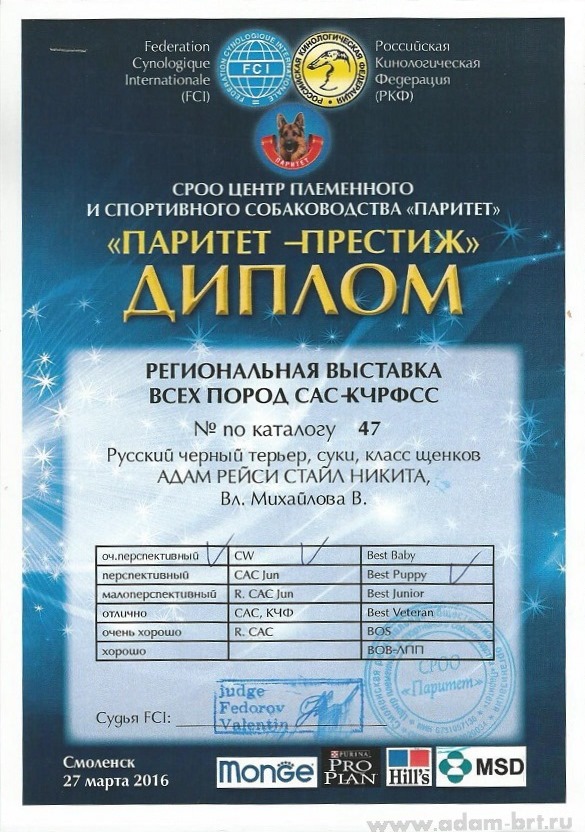 27 марта в Смоленске проходила Региональная Выставка Всех Пород CAC-КЧРФСС "ПАРИТЕТ-ПРЕСТИЖ", на которой приняли участие Адам Рэйси Стайл НИКОЛЬ и НИКИТА, где под судейством эксперта Федорова В., Беларусь