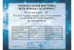 Сертификаты: 5 x ЛУЧШАЯ СОБАКА ВЫСТАВКИ, 1 x ЛУЧШАЯ СОБАКА ВЫСТАВКИ ЮНИОР-II, 2 x ЛУЧШАЯ СОБАКА В ГРУППЕ-II, 4 x ЛУЧШАЯ СОБАКА В ГРУППЕ-III, 5 x CACIB, 1 x R.CACIB и многие другие.