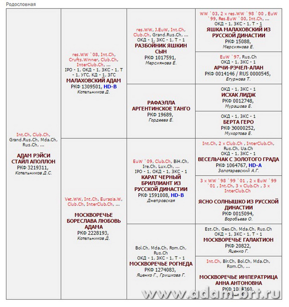 Имеет титулы: Интерчемпион (FCI), Чемпион НКП, Чемпион РОССИИ, Юный Чемпион РОССИИ, Гранд Чемпион РОССИИ, Призер главной Монопородной выставки КРАСНАЯ ЗВЕЗДА - 2014, Чемпион МОЛДОВЫ, Чемпион РКФ х 4, Чемпион ОАНКОО, Чемпион РФОС, Чемпион РФЛС, 4 х CACIB, 1 х R.CACIB, 5 х КЧК и другие. Родословная: