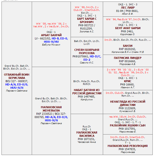 Сертификаты: 1 x CACIB, 3 x R.CACIB, 19 x CAC, 1 x Res.CAC, 11 x ЛПП, 18 x БОС.