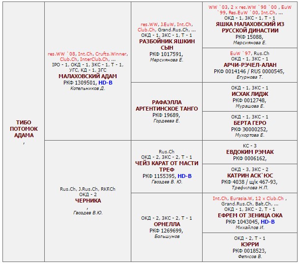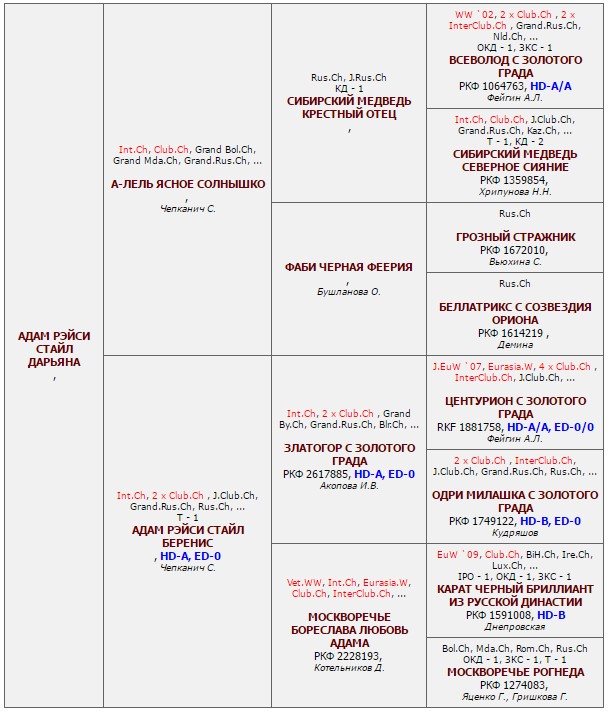 Имеет титулы: Чемпион Национального Клуба Породы, Гранд Чемпион России, Чемпион России, Юный Чемпион России, Чемпион РКФ, Чемпион РФЛС , Чемпион РФОС, Чемпион РФСС,