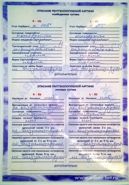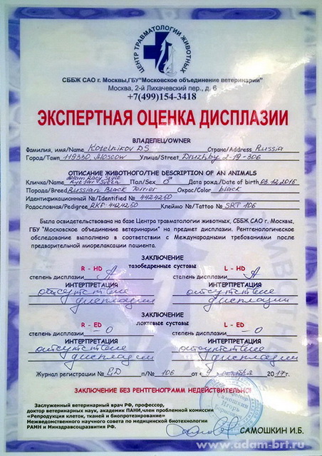 Получены превосходные результаты детальной экспертизы дисплазии ТБС и ЛС нашего молодого чемпиона от известного и уважаемого профессора Центр травматологии животных, доктора ветеринарных наук Самошкина Игоря Борисовича.