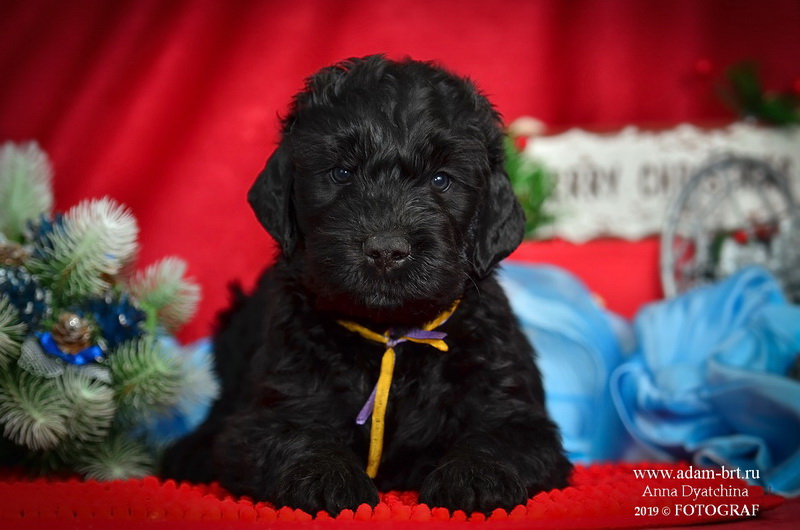 Царским деткам недавное исполнился месяц, традиционная первая фотоссесия в этот раз состоялась в праздничной студии. В новом помете к продаже предлагаются три шикарных, очень красивых и перспективных суки и три не менее знатных, крепких и слаженных кобеля, достойные продолжатели рода, великолепные щенки Русского черного терьера.