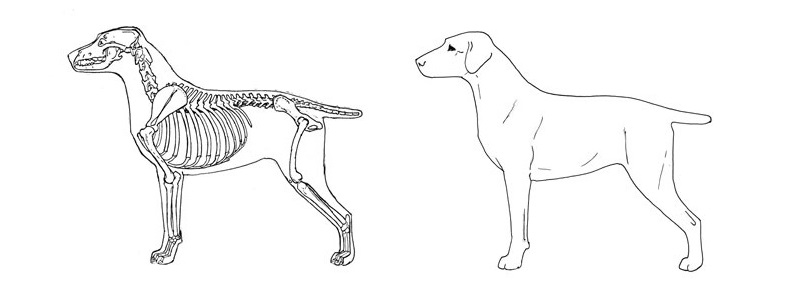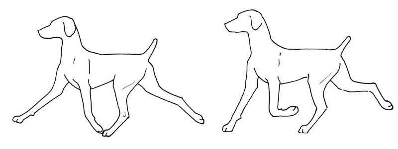 Если у собаки недостаточно выражены углы, конечности не обеспечивают корпусу должной опоры, находясь не там, где следует. У собак отсутствует необходимая ширина базы (которая обеспечивает силу мускулатуры), которая зависит от того, насколько правильны углы. О многом говорит линия низа собаки — там, где должны быть хорошие, сбалансированные углы сочленения и широкое бедро. У собаки с правильными углами будет короткая линия низа от локтя к колену, в то время как при прямом плече линия гораздо длиннее. Две собаки могут иметь одинаковую длину корпуса от передней точки грудной кости до седалищного бугра и высоту в холке, и все же их строение будет абсолютно разным, так же как и манера движения на рыси. Собака, обладающая правильными углами, свободно машет конечностью от плече-лопаточного и тазобедренного сустава, совершая длинные, стелющиеся, легкие шаги без потери энергии, в то время как собака с недостаточно выраженными углами поднимает ноги слишком высоко, производя движения, на которые требуется много дополнительных усилий и не добавляет ей выносливости. Чем выше собака поднимает конечности, тем больший путь они должны пройти, чтобы снова коснуться земли. А польза от них лишь на земле, в воздухе они не нужны. Длинный шаг — это шаг по земле.