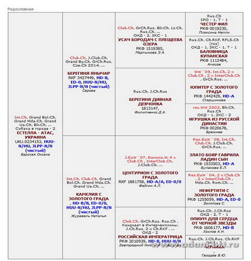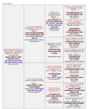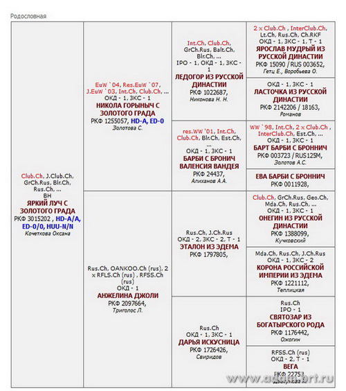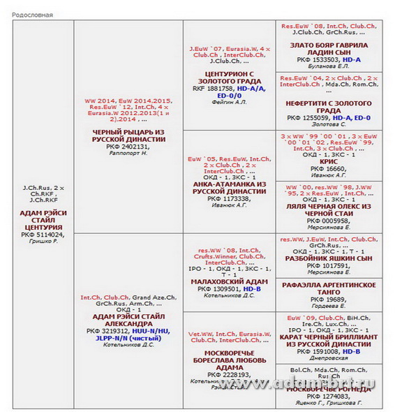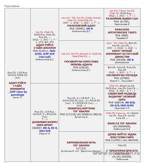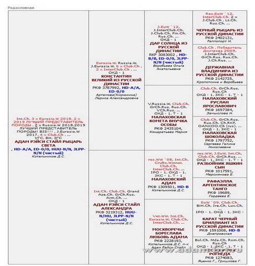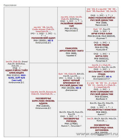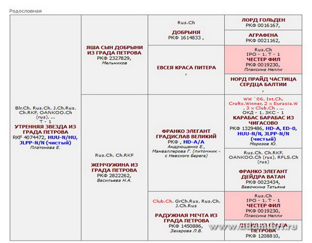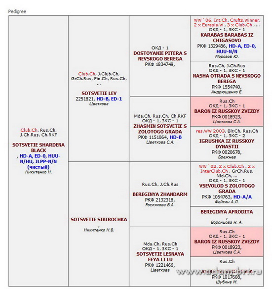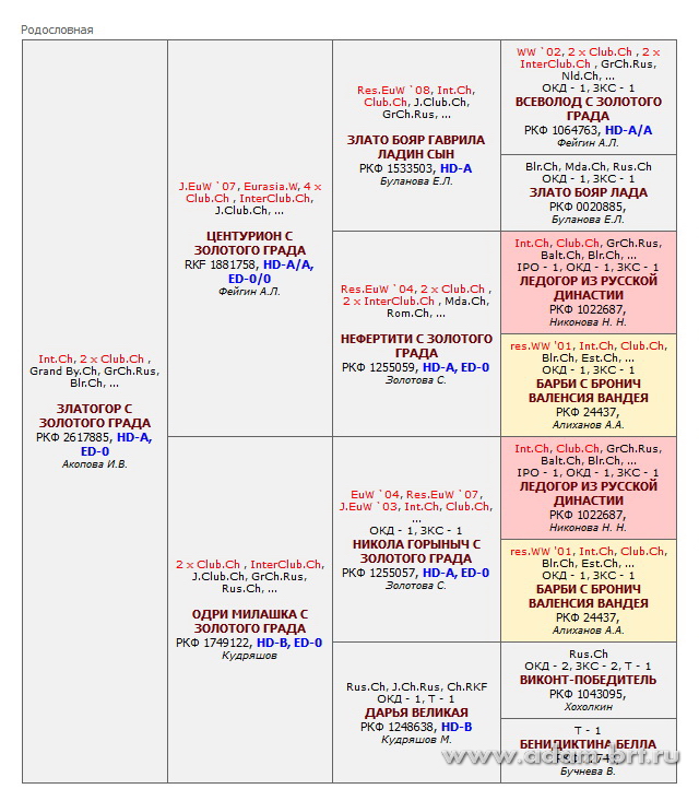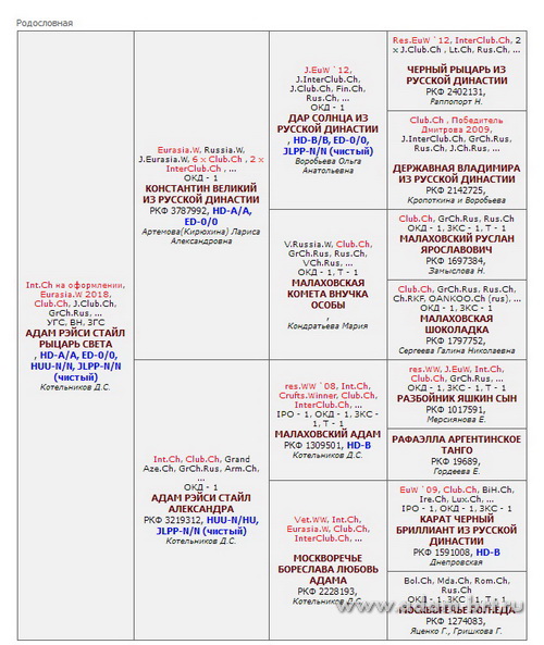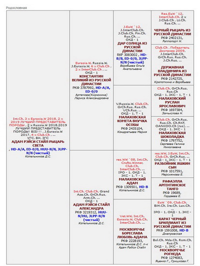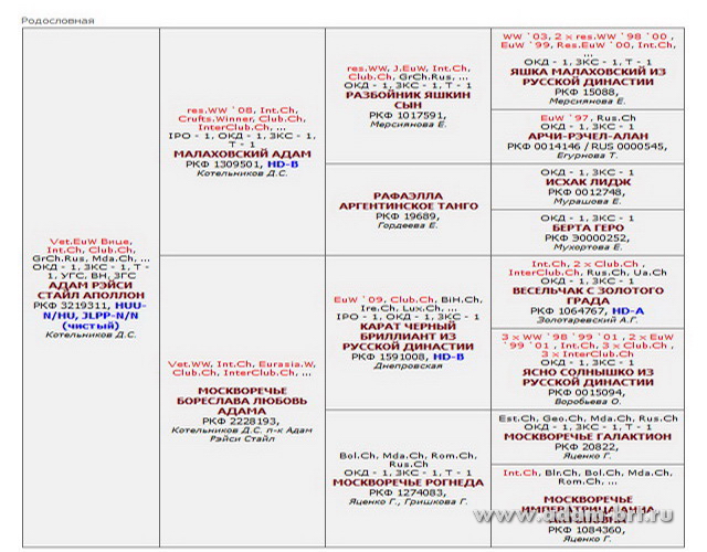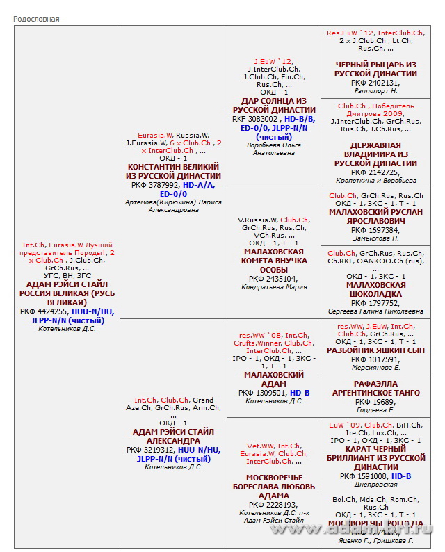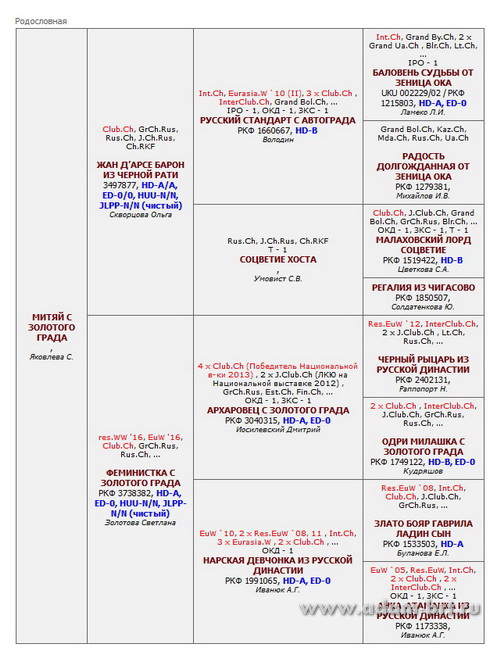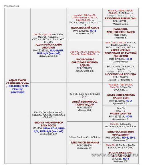 В титулах родителей: Интернациональный чемпион (FCI), Чемпион Национального клуба породы (НКП), Чемпион Российской кинологической федерации (РКФ), Гранд-чемпион России, Чемпион России, Юный чемпион России, Чемпион Российских федераций служебного и любительского собаководства (РФСС, РФЛС) и другие. Родословная: