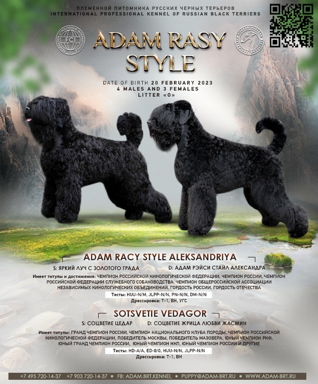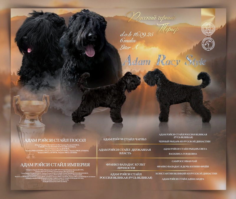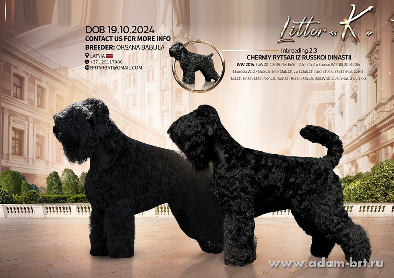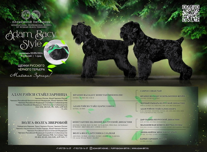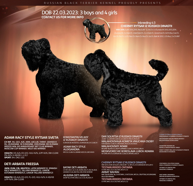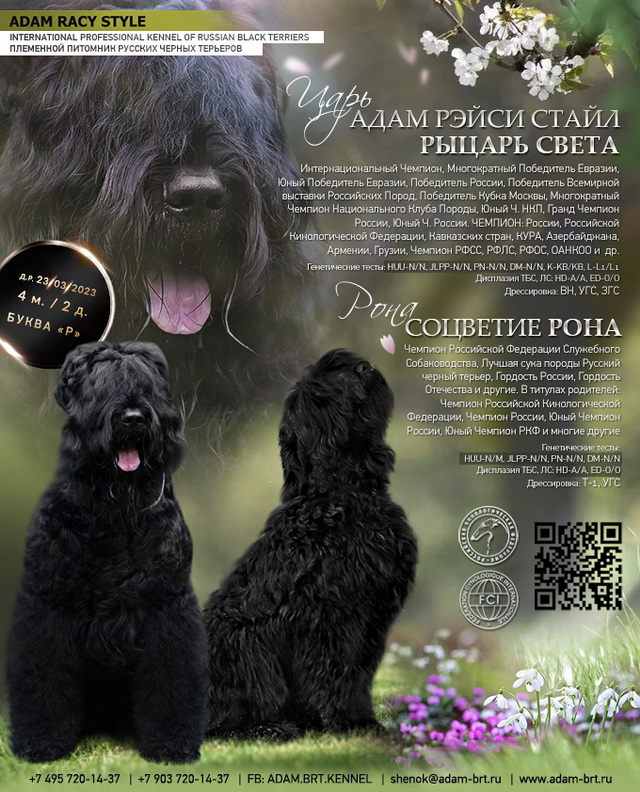 Новые интересные пометы ожидаются в питомнике в сентябре, октябре и декабре месяце, а также в начале следующего года согласно плану вязок и рождений. Известные производители и молодежь новых кровей принимают активное участие в развитии породы Русский черный терьер.
